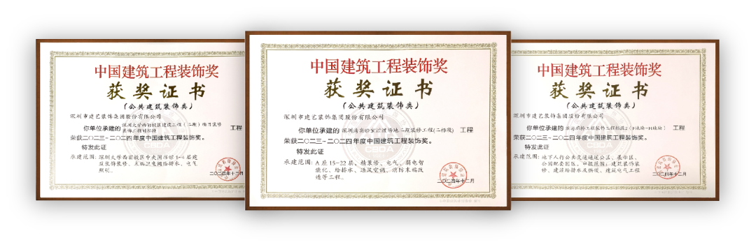 本次由建藝集團承建的“濱海廊橋工程裝飾工程標段2(F地塊-H地塊)項目、深圳大學西麗校區(qū)建設工程(二期) 項目裝修裝飾工程 VI 標段、深圳灣實驗室過渡場地二期裝修工程(二標段)”三個項目榮獲2023~2024年度“中國建筑工程裝飾獎”。