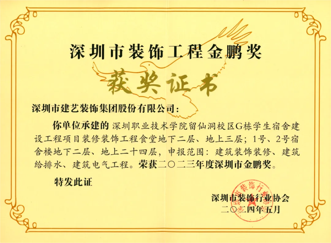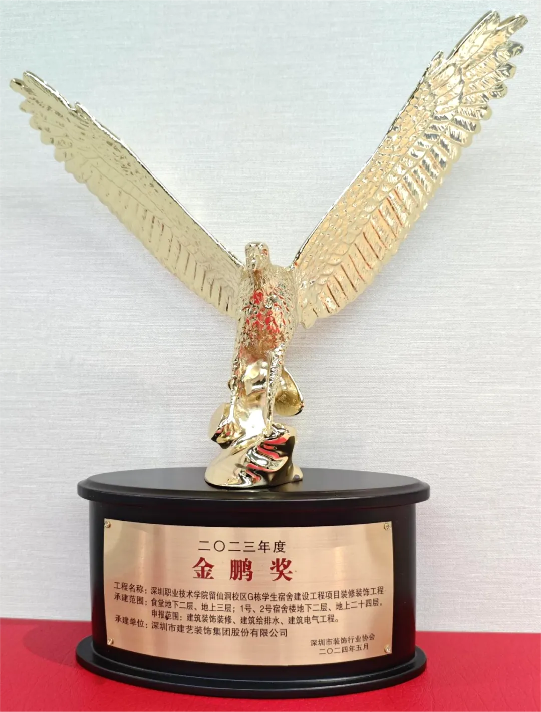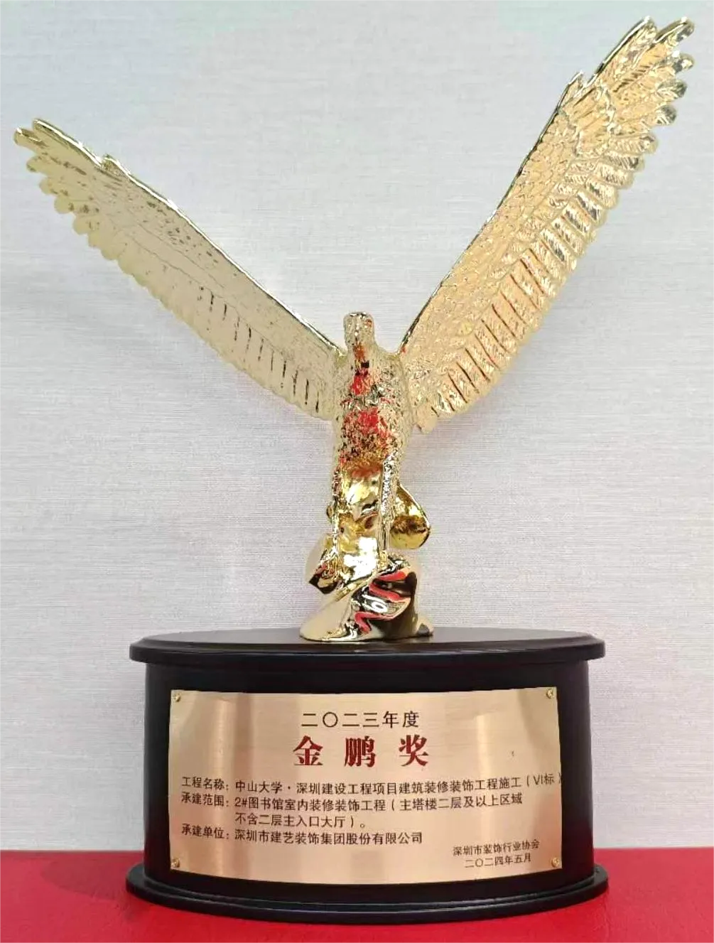 深圳市裝飾工程“金鵬獎”是目前深圳市級建筑裝飾行業(yè)最高級別質量獎項。該獎項旨在鼓勵企業(yè)增強質量管理意識,提高工程建設質量和項目管理水平,展現(xiàn)深圳裝飾企業(yè)的風采及工程質量水平,樹立深圳裝飾行業(yè)內(nèi)的優(yōu)秀企業(yè)和精品工程典范。