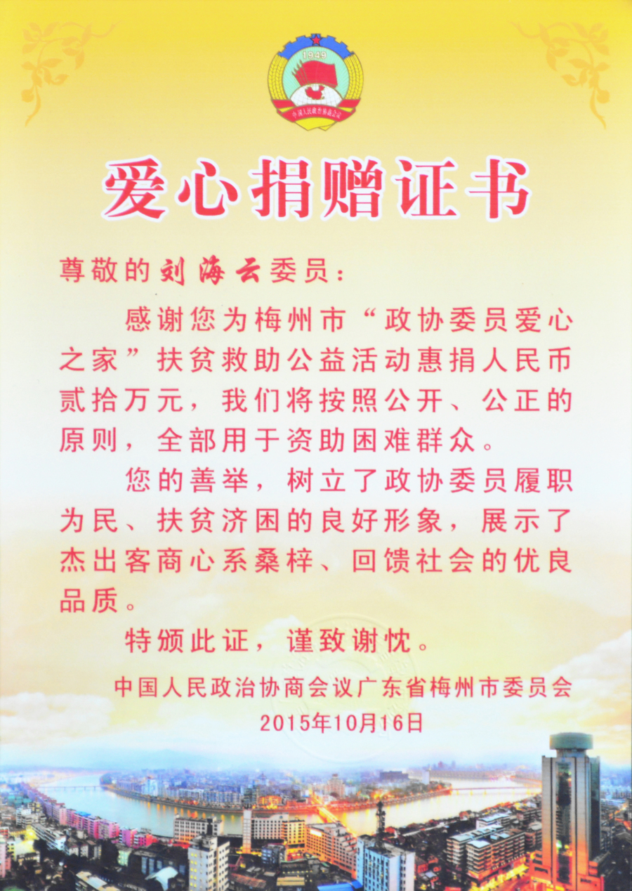 在2019年度“廣東扶貧濟(jì)困日”活動中,劉海云向平遠(yuǎn)縣仁居鎮(zhèn)捐贈善款100萬元,用于支持當(dāng)?shù)氐缆窐蛄航ㄔO(shè);廣東興寧水口鎮(zhèn)洋新村老人活動中心新農(nóng)村建設(shè)共捐贈900多萬元;廣東平遠(yuǎn)縣扶貧助學(xué)捐助270萬元;廣東興寧教育強(qiáng)市捐助200萬元;廣東興寧公益慈善共捐630萬元;廣東平遠(yuǎn)縣發(fā)展教育基金會成立暨捐贈儀式上向基金會捐贈800萬元;廣東興寧市水口鎮(zhèn)2020年教育發(fā)展基金啟動中帶頭認(rèn)捐1000萬元……