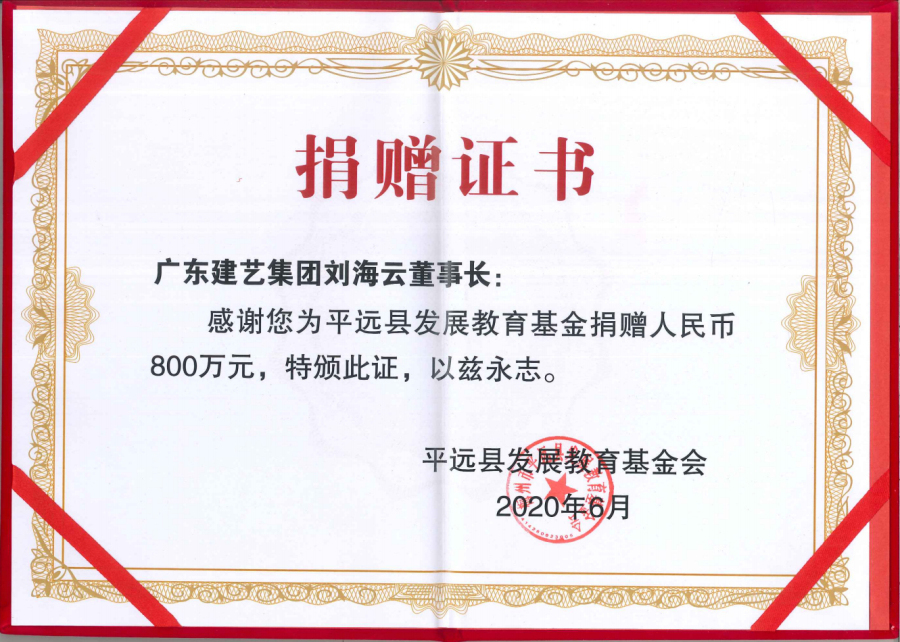 從1994年成立至今,作為廣東企業(yè)500強(qiáng)的建藝集團(tuán),始終把“以德為先,誠信為本,構(gòu)筑精品為目標(biāo)”的企業(yè)宗旨體現(xiàn)在促進(jìn)國家、民族與社會的繁榮進(jìn)步之中。董事會主席劉海云更是以身作則,堅持用大愛回饋社會,累計捐資數(shù)千萬元,為大批貧困地區(qū)提供支持,極大促進(jìn)了當(dāng)?shù)亟逃⑨t(yī)療、民生等事業(yè)的進(jìn)步發(fā)展。