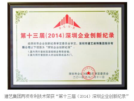 日前,建藝集團在深圳工業(yè)總會及深圳市企業(yè)創(chuàng)新記錄組織委員會共同舉辦的“第十三屆深圳企業(yè)創(chuàng)新記錄”評選中,一舉奪得“自主創(chuàng)新企業(yè)金獎”榮譽,為企業(yè)在科技創(chuàng)新領(lǐng)域的發(fā)展增添新輝。另外,建藝集團兩項創(chuàng)新專利技術(shù)——“雙層輕鋼龍骨隔音墻”及“防火折邊貼面成品木門”更是榮獲“第十三屆(2014)深圳企業(yè)創(chuàng)新記錄”獎,經(jīng)審定委員會審定,建藝集團的這兩項技術(shù)均為國內(nèi)同行首創(chuàng)。