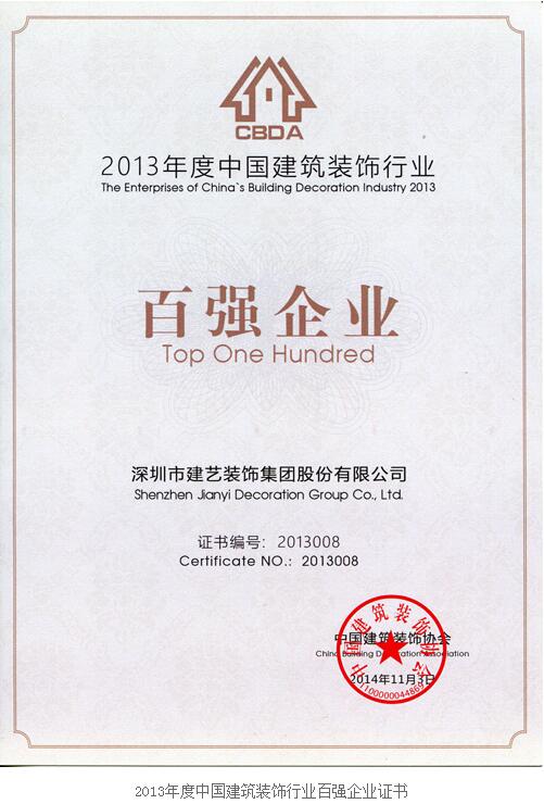 建藝集團榮獲“2013年度中國建筑裝飾行業(yè)百強企業(yè)”第八名