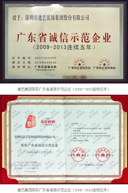 注重品牌與誠信,是建藝集團(tuán)一直以來都遵循的發(fā)展準(zhǔn)則。多年來,以品質(zhì)管理、誠信經(jīng)營為主旨,建藝集團(tuán)在建筑裝飾領(lǐng)域銳意進(jìn)取,為廣東經(jīng)濟(jì)社會發(fā)展推注源源動力。同時,憑借自身的誠信經(jīng)營表率,建藝集團(tuán)還以身作則,積極為廣東省企業(yè)誠信體系建設(shè)做出應(yīng)盡貢獻(xiàn)。在4月23日舉辦的第20屆廣東省“企業(yè)家活動日”大會上,一批2013年度廣東省優(yōu)秀企業(yè)、優(yōu)秀企業(yè)家、最佳誠信企業(yè)、誠信示范企業(yè)受到表彰,建藝集團(tuán)憑借出眾的誠信管理體系及卓越的行業(yè)發(fā)展表率,再次得到肯定,喜獲“2013年度廣東省優(yōu)秀企業(yè)”及“廣東省誠信示范企業(yè)(2009-2013連續(xù)五年)”殊榮,為建藝集團(tuán)2014年“榮譽(yù)簿”譜寫了濃墨重彩的一筆。