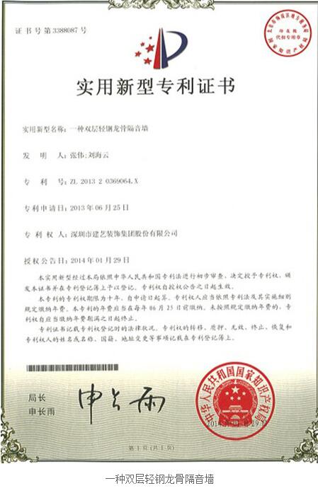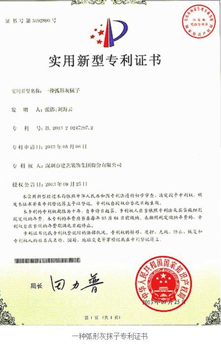近日,建藝集團(tuán)研發(fā)的二項(xiàng)實(shí)用新型專利正式獲得國家知識(shí)產(chǎn)權(quán)局的授權(quán)。該二項(xiàng)專利為:一種弧形灰抹子(專利號(hào):ZL201320247297.2)、一種雙層輕鋼龍骨隔音墻(專利號(hào):ZL201320369064.X)。