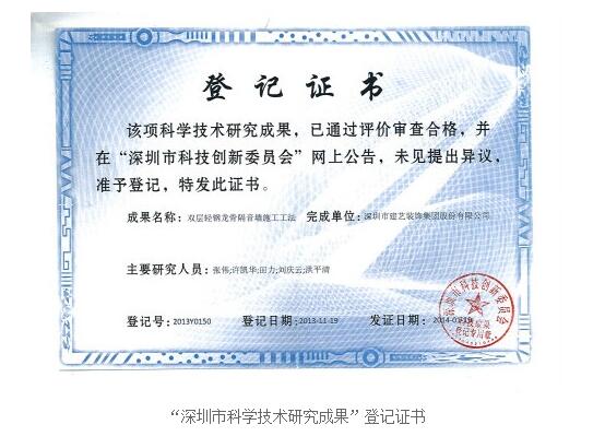 日前,建藝集團(tuán)研發(fā)的“雙層輕鋼龍骨隔音墻施工工法”順利通過深圳市科技創(chuàng)新委員會的評價審查,獲得“深圳市科學(xué)技術(shù)研究成果”登記證書。