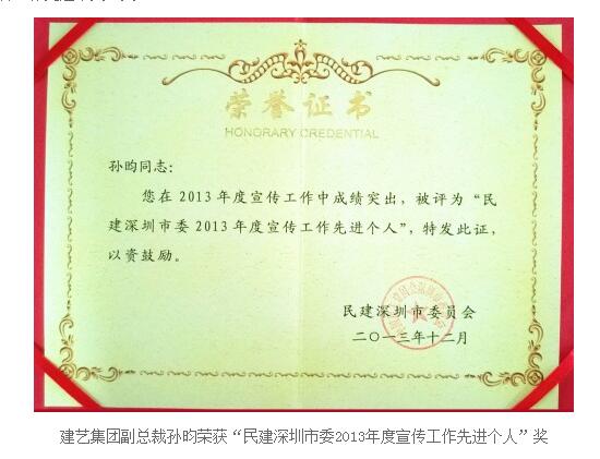 近日,中國民主建國會(簡稱民建)深圳市委員會開展了“2013年度先進集體和先進個人”表彰活動,共有20個民建支部榮獲先進集體獎,數(shù)十位先進工作者獲得“參政議政工作先進個人”及“宣傳理論工作先進個人”獎。作為民建基層骨干成員,建藝集團副總裁孫昀在此次評選中,榮獲了“民建深圳市委2013年度宣傳工作先進個人”獎。