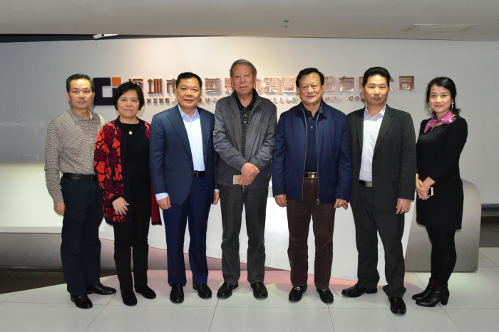 建藝集團(tuán)董事長(zhǎng)兼總裁劉海云(左三)等與中國(guó)建筑裝飾協(xié)會(huì)會(huì)長(zhǎng)李秉仁(左四)、副會(huì)長(zhǎng)兼秘書(shū)長(zhǎng)劉曉一(左五)在集團(tuán)大廳合影