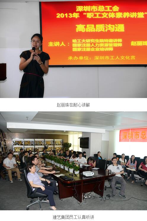 為了提升集團(tuán)總部員工的溝通能力,提高各部門、各個(gè)職員的工作效率,2013年6月19日下午,深圳市總工會2013年“職工文體素養(yǎng)講堂”走進(jìn)建藝集團(tuán),并特別邀請哈爾濱工業(yè)大學(xué)研究生院講師、國家注冊人力資源管理師趙麗珠為集團(tuán)總部全體員工開展了一次高品質(zhì)溝通培訓(xùn)課程。