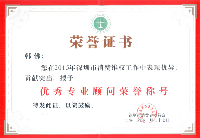 會議最后對在2015年消費維權工作中表現(xiàn)突出的7位專業(yè)顧問進行表彰,建藝集團工程總監(jiān)韓佛獲“優(yōu)秀專業(yè)顧問”榮譽稱號,頒獎儀式后會議順利結束。