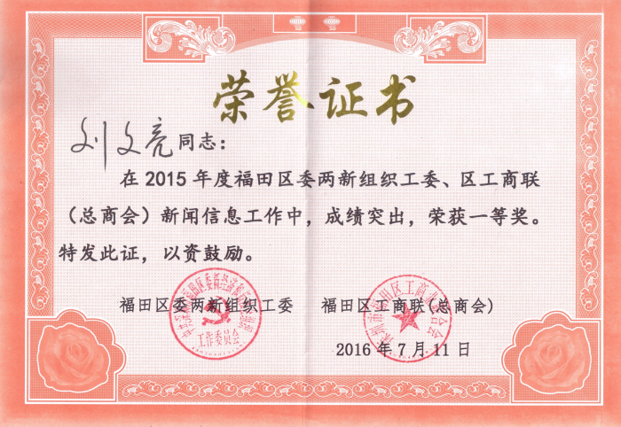 建藝集團(tuán)企業(yè)文化部總經(jīng)理劉傳偉獲得的榮譽(yù)證書
