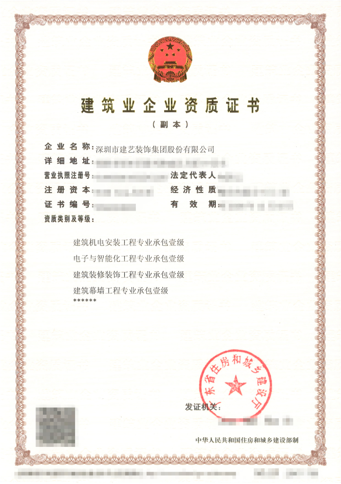 在2016年3月11日建藝集團成功在深交所A股上市后,集團的發(fā)展可謂是邁出了一大步。為積極響應集團“雙百億”戰(zhàn)略目標,行政管理中心人力資源部按照集團領(lǐng)導要求,全力提升集團各項資質(zhì),為建藝巨艦在建筑裝飾行業(yè)這片汪洋中劈浪遠行保駕護航。截止目前,集團現(xiàn)有的建設(shè)工程企業(yè)資質(zhì)廣泛涵蓋了建筑裝修裝飾、建筑幕墻、防水防腐保溫、建筑機電安裝、電子與智能化、城市園林綠化和鋼結(jié)構(gòu)等方面。建藝集團具體資質(zhì)如下: