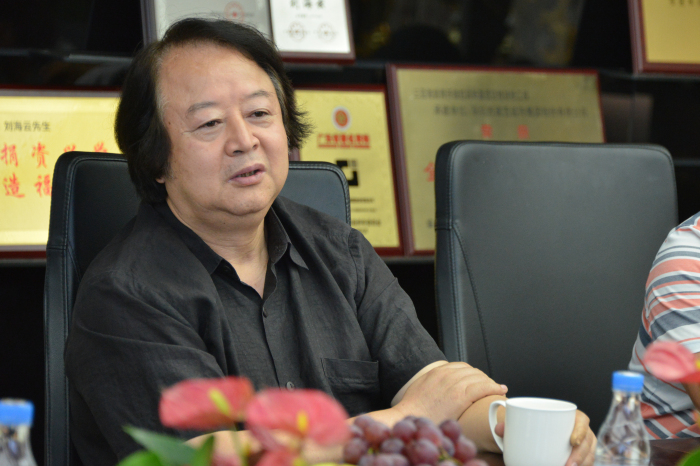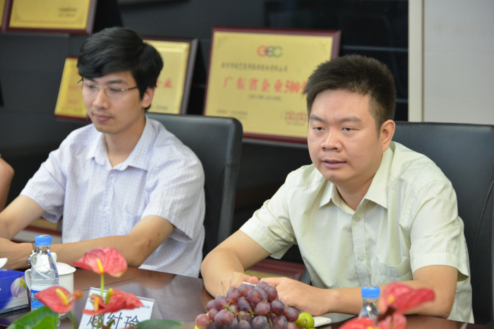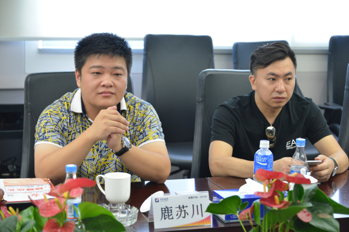 鹿蘇川總經(jīng)理(左)在會上聽取關(guān)于建藝集團(tuán)的介紹