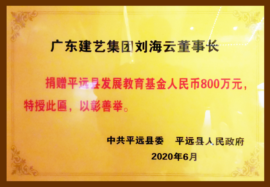 心系平遠(yuǎn),大愛(ài)無(wú)疆;關(guān)注經(jīng)濟(jì),振興教育。從早年廣東建藝石材落戶平遠(yuǎn),到2015年廣東建藝科技工業(yè)園項(xiàng)目動(dòng)工,再到2020年與縣政府簽訂總投資額1億元的裝配式建材生產(chǎn)線投資協(xié)議……在經(jīng)濟(jì)振興領(lǐng)域,劉海云董事長(zhǎng)為平遠(yuǎn)地方經(jīng)濟(jì)發(fā)展傾注了大量心血,建藝科技、建藝筑工、建藝石材共投資約3億元。與此同時(shí),在民生保障與慈善捐贈(zèng)上,劉海云董事長(zhǎng)更是多年來(lái)始終如一地向平遠(yuǎn)持續(xù)輸出愛(ài)心,并力所能及地支持、助力當(dāng)?shù)胤鲐毠ぷ?。早?012年,劉海云董事長(zhǎng)就資助100萬(wàn)元善款用于平遠(yuǎn)縣大佛寺建設(shè);在2019年度“廣東扶貧濟(jì)困日”活動(dòng)中,劉海云董事長(zhǎng)再次伸出援手,向平遠(yuǎn)縣仁居鎮(zhèn)捐贈(zèng)善款100萬(wàn)元,用于支持當(dāng)?shù)氐缆窐蛄航ㄔO(shè);2020年,當(dāng)新冠肺炎疫情席卷平遠(yuǎn)縣境之時(shí),劉海云董事長(zhǎng)更是第一時(shí)間指示相關(guān)人員向平遠(yuǎn)縣紅十字會(huì)援助1萬(wàn)只口罩,以解當(dāng)?shù)匾咔榉揽禺?dāng)務(wù)之急……