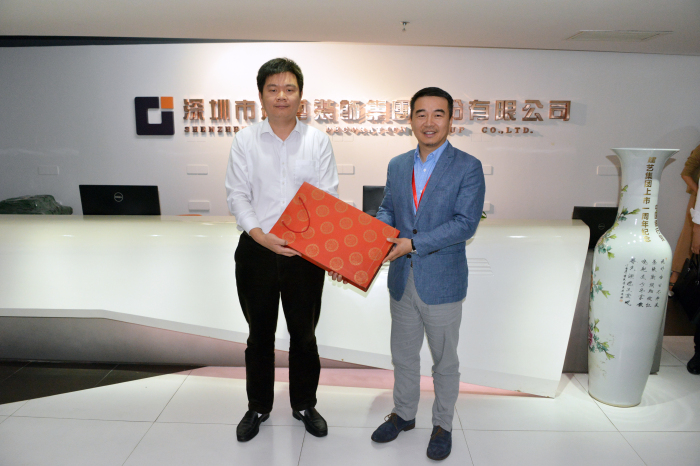 蘇州市裝修裝飾行業(yè)協(xié)會(huì)會(huì)長(zhǎng)楊震(右)向建藝集團(tuán)贈(zèng)送禮品