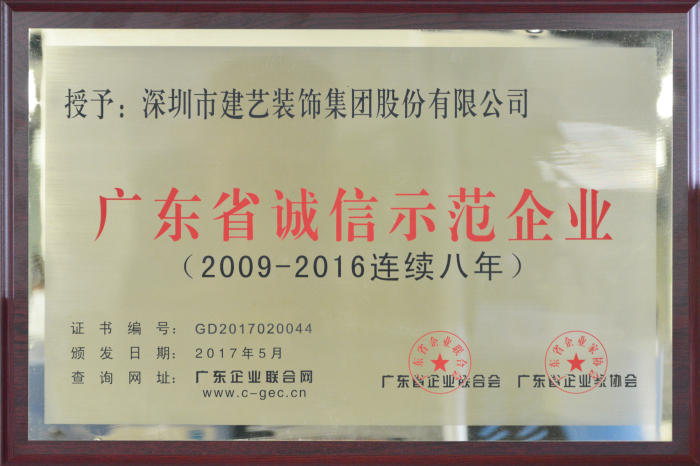 作為中國建筑裝飾行業(yè)百強企業(yè)前十名企業(yè),建藝集團(tuán)歷來注重品牌與誠信建設(shè)。多年來,以專業(yè)管理、誠信經(jīng)營、品牌塑造為主旨,建藝人在建筑裝飾領(lǐng)域銳意進(jìn)取、勇攀新高,用實實在在的誠信經(jīng)營口碑及強大的品牌影響力,為社會貢獻(xiàn)了一大批裝飾裝修工程精品,并盡自身能力不斷推動廣東社會經(jīng)濟發(fā)展。5月10日,在廣東省企業(yè)聯(lián)合會/廣東省企業(yè)家協(xié)會主辦的“第23屆廣東省企業(yè)家活動日”大會上,建藝集團(tuán)憑借出眾的誠信管理體系及卓越的行業(yè)發(fā)展表率,再次蟬聯(lián)“廣東省優(yōu)秀企業(yè)(2016年度)”及“廣東省誠信示范企業(yè)(2009-2016連續(xù)八年)”。