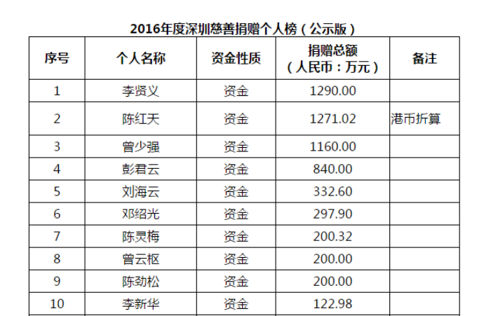 《2016年度深圳慈善捐贈(zèng)榜》公示鏈接:
