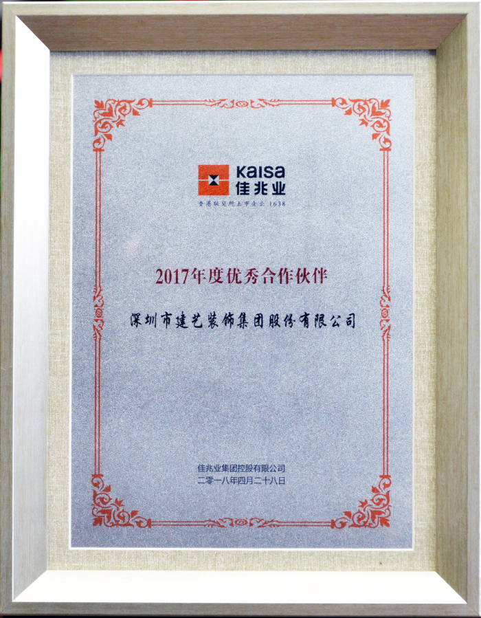 開創(chuàng)新時代的良好發(fā)展格局,離不開合作伙伴的匠心精神。本著公平公正的原則,佳兆業(yè)集團對所有合作伙伴進行嚴(yán)格評估,峰會現(xiàn)場頒發(fā)了“2017年度優(yōu)秀合作伙伴”等五大獎項,以表彰2017年度在品質(zhì)、設(shè)計、服務(wù)、貢獻、長期合作等方面做出杰出貢獻的合作伙伴及優(yōu)秀個人。建藝集團憑借卓越的合作表現(xiàn)及長期以來對品質(zhì)的無懈追求,榮獲“2017年度優(yōu)秀合作伙伴”獎。