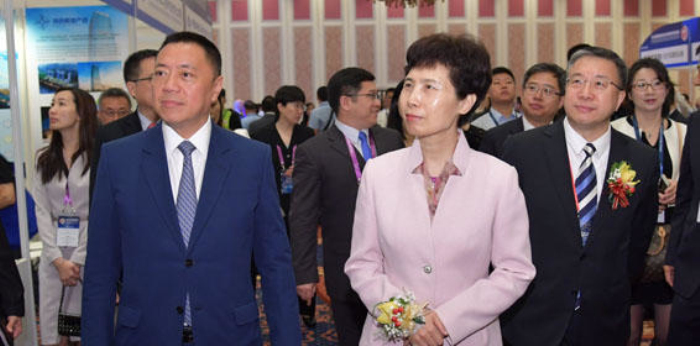 中國(guó)商務(wù)部高燕副部長(zhǎng)、澳門特別行政區(qū)經(jīng)濟(jì)財(cái)政司梁維特司長(zhǎng)和中國(guó)對(duì)外承包工程商會(huì)房秋晨會(huì)長(zhǎng)于論壇開(kāi)幕式前巡視展區(qū)