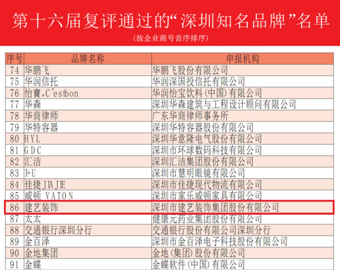 日前,深圳知名品牌評(píng)價(jià)委員會(huì)公布了第十六屆“深圳知名品牌”復(fù)審?fù)ㄟ^企業(yè)名單,剛剛獲評(píng)為“深圳老字號(hào)”的建藝集團(tuán),其所持有的“建藝裝飾”品牌順利通過復(fù)審,第五次榮膺“深圳知名品牌”稱號(hào)。