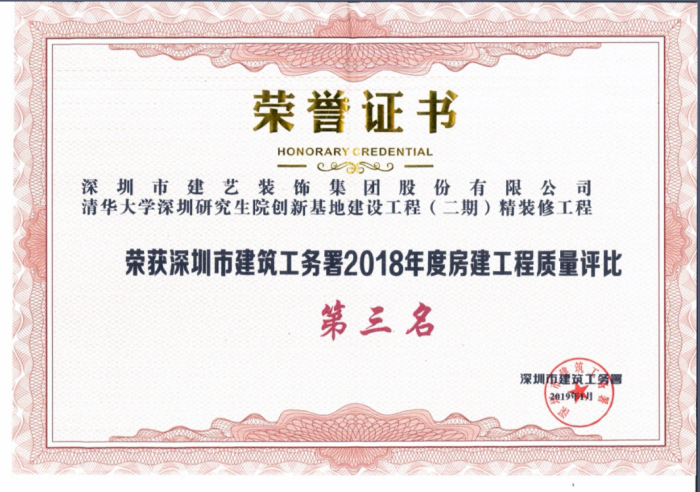 2018年度深圳市建筑工務(wù)署工程質(zhì)量評(píng)比第三名(建藝集團(tuán))