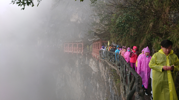 四月的天,喜怒無常,讓人琢磨不透。登天門山前往玻璃棧道與鬼谷棧道的過程中,山上風(fēng)雨交加,云霧蒙蒙。整個(gè)天門山系就猶如含羞的少女,猶抱琵琶半遮面,隱藏在煙雨中。而此時(shí)此刻的天門山頂景區(qū),也宛如仙境一般迷人。置身于云霧中的建藝人,穿著五顏六色的雨衣,在云雨中彼此攜手結(jié)伴,奮勇前進(jìn),成為了景區(qū)的一道“獨(dú)特風(fēng)景線”。