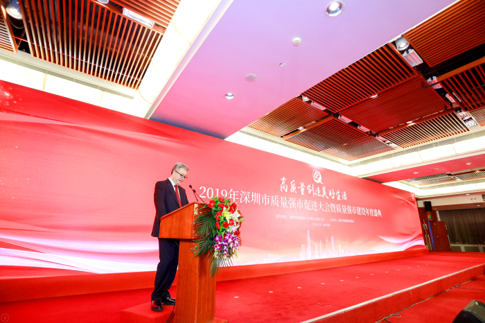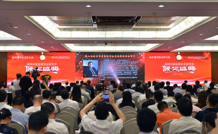 千磨萬擊還堅勁,任爾東西南北風。劉海云董事長等10位優(yōu)秀企業(yè)家的杰出事跡深深打動了現(xiàn)場的每一位與會嘉賓,現(xiàn)場掌聲更是持久而熱烈。隨后,深圳市副市長黃敏及促進會會長馬蔚華親自登臺,為劉海云董事長等獲獎企業(yè)家佩戴這枚代表著深圳市最高個人質量榮譽的“深圳市質量強市金質獎章”并頒發(fā)獲獎證書,對其在創(chuàng)建“深圳標準”,打造“深圳質量”,建設“質量強市”工作中的杰出表現(xiàn)表示肯定,并鼓勵獲獎企業(yè)家在未來再接再厲,帶領企業(yè)邁上高質量發(fā)展新臺階!