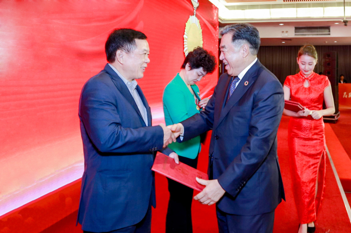 促進會會長馬蔚華為劉海云董事長佩戴金質獎章并頒發(fā)證書
