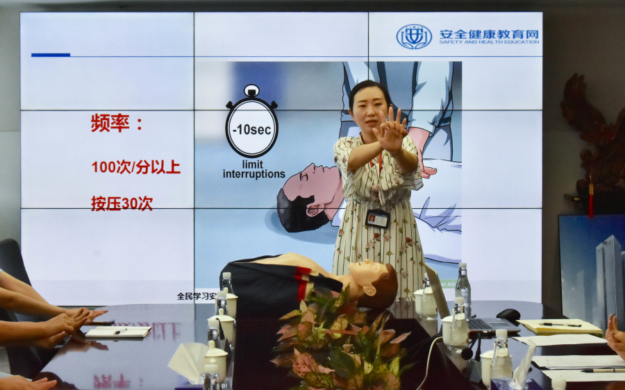 蔣老師指導員工實踐CPR(現(xiàn)場心肺復蘇術)要領