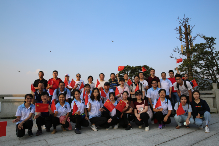 在山腳下出發(fā)前,集團(tuán)工會(huì)特別組織近百名員工齊聲高歌《我和我的祖國(guó)》,以此抒發(fā)建藝人強(qiáng)烈的愛國(guó)熱情,為國(guó)慶獻(xiàn)禮!在合影留念后,劉海云董事長(zhǎng)親自率領(lǐng)建藝人高舉旗幟向山頂進(jìn)發(fā)。雖然下午的天氣稍有些炎熱,但建藝人還是熱情高漲,井然有序地向上前行。一路上大家有說有笑,相互協(xié)助、相互激勵(lì),偶爾停下來留影拍照。沿途有不少登山的市民看到我們身穿統(tǒng)一印有“建藝集團(tuán)”字樣的運(yùn)動(dòng)衫,手中還舉著小國(guó)旗,紛紛向這支高素質(zhì)的團(tuán)隊(duì)表示敬意。