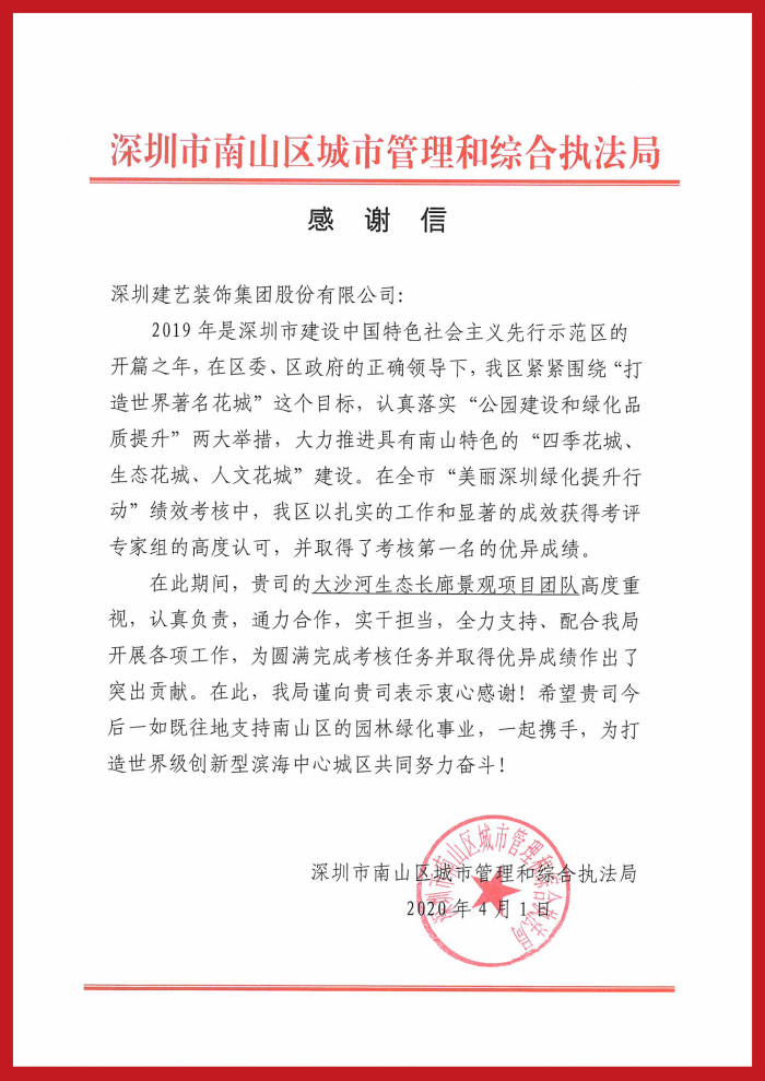在得知深圳市開展“美麗深圳綠化提升行動”績效考核后,建藝集團(tuán)大沙河生態(tài)長廊景觀項目團(tuán)隊高度重視,并全力配合、協(xié)助南山區(qū)城市管理和綜合執(zhí)法局開展各項相關(guān)工作,最終助力區(qū)城管局圓滿完成考核任務(wù)并取得考核第一名的優(yōu)異成績。