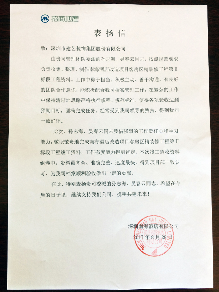 日前,在南海酒店改造項目客房區(qū)精裝修工程第二標段工程資料收集、整理、制作工作中,建藝集團工程管理中心孫志海、吳春云充分發(fā)揚建藝人嚴謹務實的工作作風,以強烈的責任心完成全部工作內(nèi)容,獲得了項目部的一致認可,并受到深圳南海酒店有限公司的通報表彰。