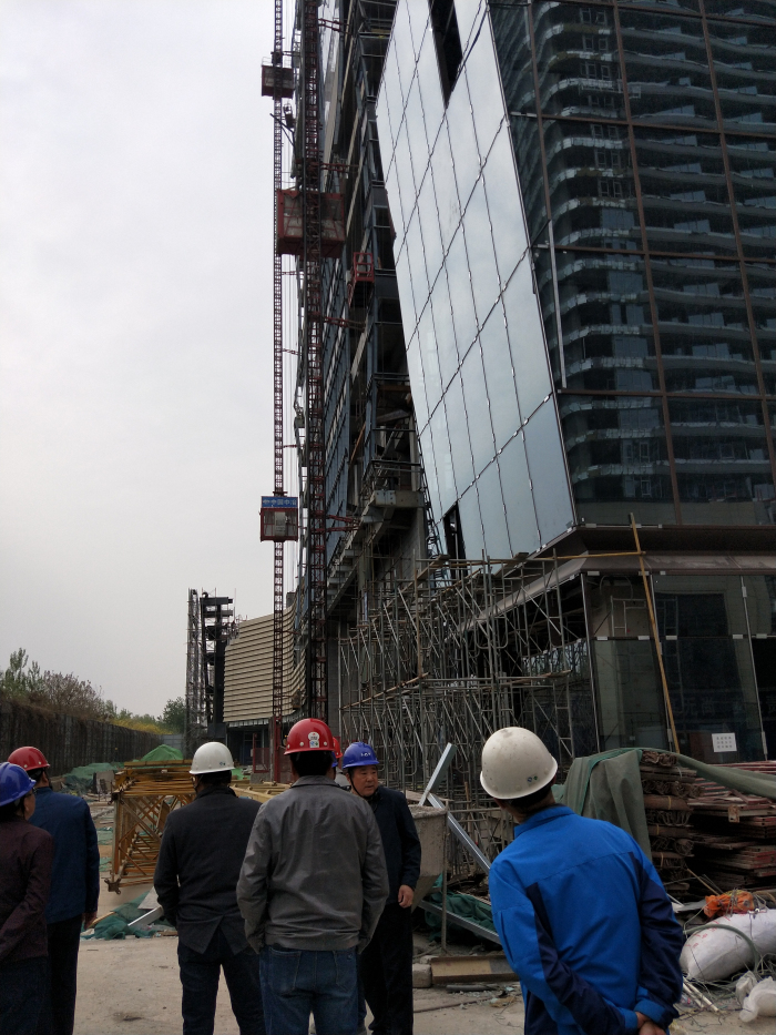 考察團一行領導查看我司施工的斜面玻璃幕墻效果