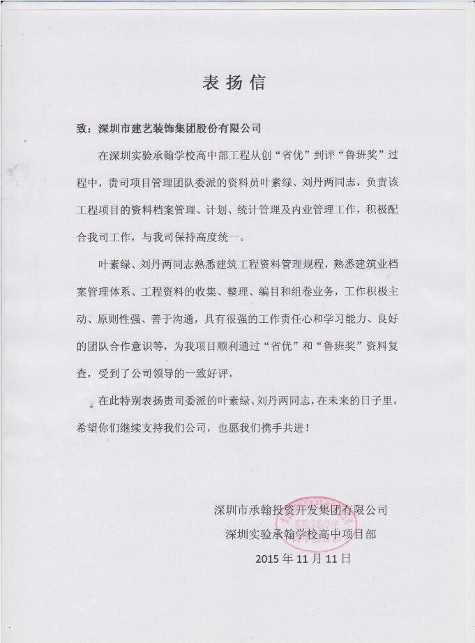 日前,建藝集團(tuán)工程管理中心資料員葉素綠、劉丹在負(fù)責(zé)深圳實(shí)驗(yàn)承翰學(xué)校高中部工程的資料檔案管理、計(jì)劃、統(tǒng)計(jì)管理及內(nèi)業(yè)管理工作期間,工作積極主動(dòng),憑借強(qiáng)烈的工作責(zé)任心與團(tuán)隊(duì)合作意識(shí),獲得了項(xiàng)目部的一致認(rèn)可,受到通報(bào)表揚(yáng),體現(xiàn)出了建藝人的敬業(yè)精神,并為該工程順利通過“省優(yōu)”及“魯班獎(jiǎng)”評獎(jiǎng)資料復(fù)查做出了突出貢獻(xiàn)。