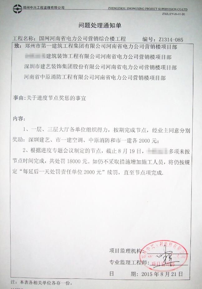 日前,建藝集團國網(wǎng)河南省電力公司營銷綜合樓內(nèi)裝飾工程施工項目部因組織得力、管理有方,并在施工過程中克服了人員不足、技術(shù)力量有限、工期進度要求緊、持續(xù)高溫等諸多不利因素,項目部管理人員以身作則,以高度負責(zé)的責(zé)任意識全面提高施工效率,并采取24小時現(xiàn)場監(jiān)管及第一時間處理突發(fā)問題等一系列強有力措施,按時保質(zhì)保量的完成了項目多個節(jié)點進度目標,受到了業(yè)主方的嘉獎,為建藝集團再次爭得榮譽,同時也為項目部樹立了新的標桿。
