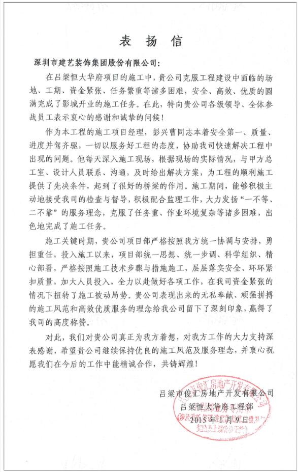 我司承建的山西呂梁恒大華府影劇院項目,在面臨前期相關方進度嚴重滯后等嚴峻挑戰(zhàn)時,項目部工程人員克服種種困難,不怕苦,不怕累,精心組織,科學安排,全力沖刺,全力配合,最終憑借努力付出,達到了業(yè)主方的進度目標要求,確保了影劇院準時開業(yè)。業(yè)主方對我司工程人員的高超管理水平以及對項目工作的高度負責任精神表示極大認同,對我司在該項目上所做出的巨大努力和突出表現(xiàn)表示了高度贊揚!