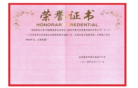 建藝集團(tuán)喜獲金地集團(tuán)“2013年度項(xiàng)目評(píng)估綜合合格率區(qū)域第三名”榮譽(yù)