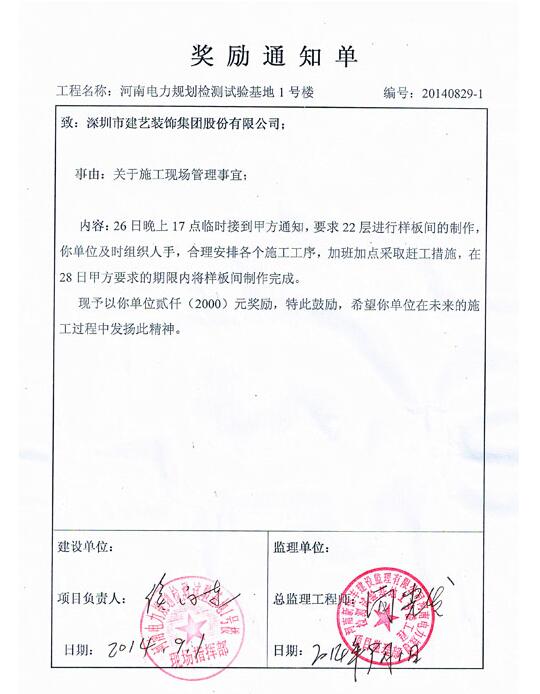 業(yè)主方在對樣板間進行查看時,在現(xiàn)場就肯定了我司項目部的施工組織和施工管理,令項目部人員倍感欣慰。出人意料的是,現(xiàn)場指揮部和現(xiàn)場監(jiān)理部更是在后期送來了書面獎勵通知單,并給予項目部貳仟元的現(xiàn)金獎勵,使我項目部人員大受鼓舞。我司項目部員工在接到獎勵通知后,紛紛表示以后將以更飽滿的工作熱情、更努力的工作態(tài)度,做好本項目的后續(xù)施工,延續(xù)建藝集團一貫的高效、優(yōu)質(zhì)施工作風(fēng)。
