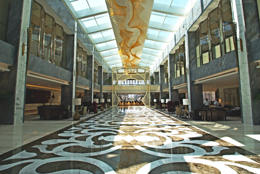西安歐御大酒店坐落于西安市內(nèi)的曲江新區(qū),建藝集團(tuán)承建的酒店大堂區(qū)域精裝修,結(jié)合西安的歷史文化背景,營造出氣勢磅礴的宏偉景象,再現(xiàn)盛世長安的盛景。