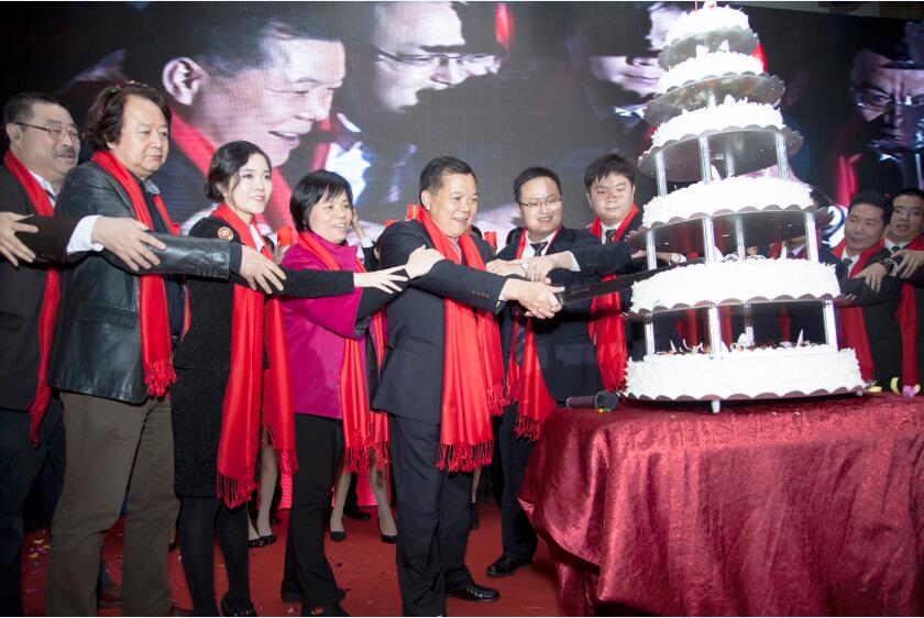 建藝集團(tuán)董事長劉海云(左五)與全體集團(tuán)高管共同切下企業(yè)二十周年華誕蛋糕