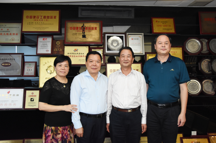 廣東省梅州市政協(xié)主席陳建青(右二)、副主席李忠良(右一)在建藝榮譽(yù)墻前同劉海云董事長(zhǎng)及顏如珍副總裁合影