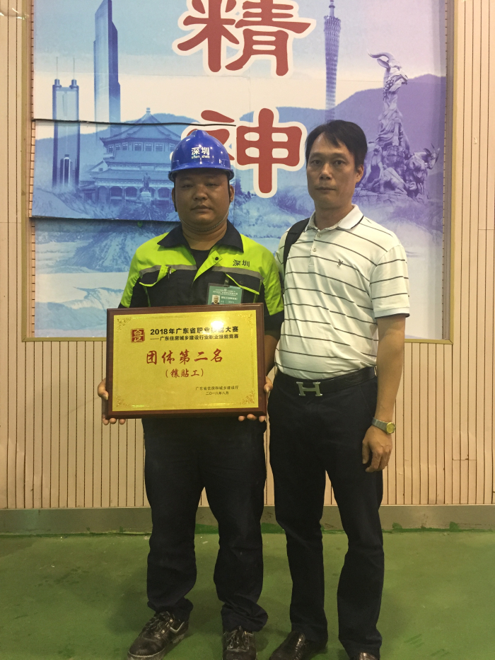 在深圳市住房和建設(shè)局統(tǒng)籌指導(dǎo)下,深圳建筑業(yè)協(xié)會(huì)和深圳市裝飾行業(yè)協(xié)會(huì)快速組織開展優(yōu)秀工匠的推選及組隊(duì)工作,經(jīng)過層層選拔,鑲貼工及鑲貼工創(chuàng)新創(chuàng)意項(xiàng)目工種最終確定12名參賽選手代表深圳工匠出征。建藝集團(tuán) “明星”工匠楊聰彬作為12名參賽選手之一代表深圳出征廣東省職業(yè)技能大賽,并在本次技能大賽鑲貼工比賽中斬獲了全省團(tuán)體第二名。