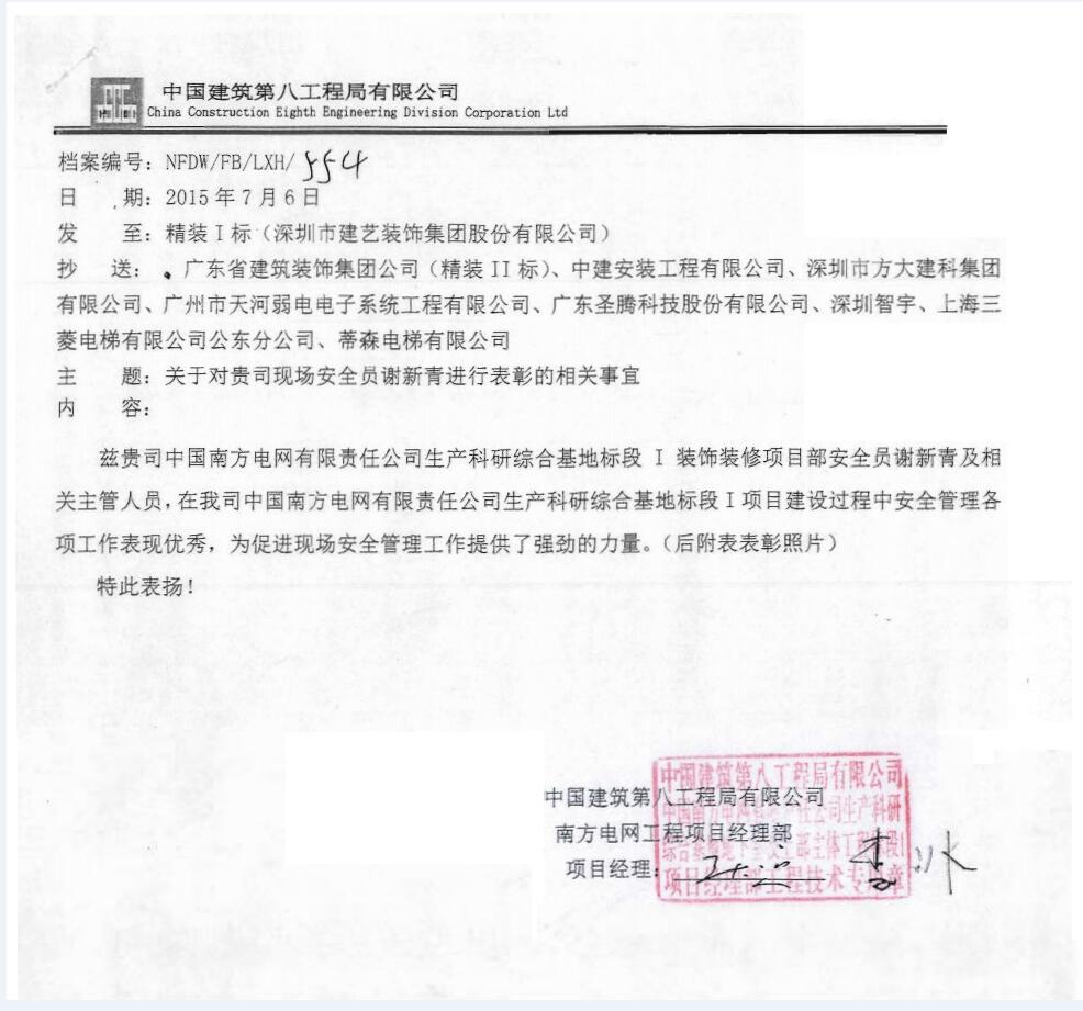建藝集團安全員謝新青獲中建八局南方電網(wǎng)項目部通報表彰