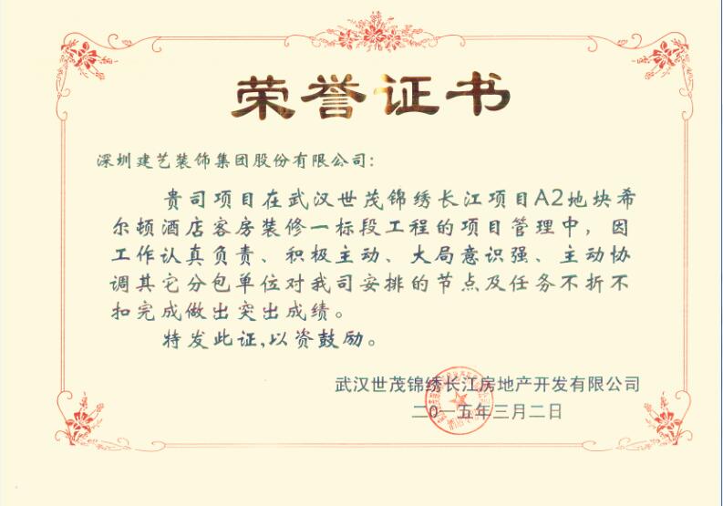 關(guān)于武漢世茂錦繡長(zhǎng)江項(xiàng)目A2地塊希爾頓酒店客房裝修一標(biāo)段工程的榮譽(yù)表彰證書