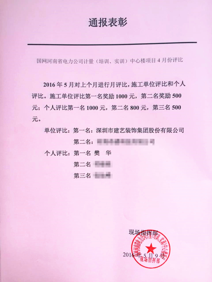 建藝集團項目部在國網(wǎng)河南省電力公司計量(培訓(xùn)、實訓(xùn))中心樓項目施工進度考核中成績優(yōu)異,完成了電力公司對各施工單位的考核節(jié)點任務(wù),獲得“先進集體”獎勵及“先進項目經(jīng)理”個人獎勵。